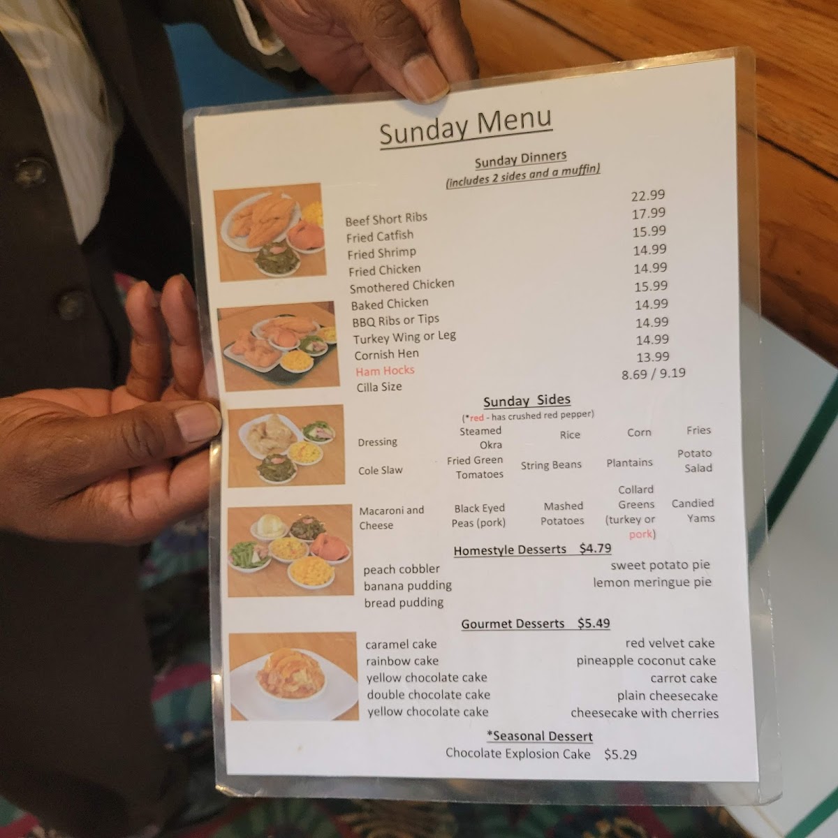“ Well, I guess I was looking lost, but Alex, who was Separating, the spoons, the forks and the knives, recognized that my colleague and I were looking lost. He quickly told me where the restrooms were, and where to order my food And place an order. He was very, very Professional and helpful.. The lady serving was also very patient just like a mother would be and showed me, The fried chicken, The smothered chicken etc. she made me feel at home, when I have never visited this place before. While it does not matter, I am from Columbus, Ohio, and here on a visit. I’ve had soul food in Columbus and I can now declare that Columbus don’t know how to do soul food. The Desserts were above what I expected, the German chocolate cake and a yellow cake with Icing. Priscilla gets high praise from me and the next time I visit in Chicago I would not leave until I Had some soul food from Priscilla. ”